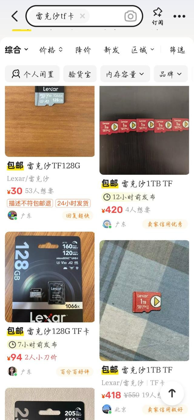 大家好我是大树,为了给我新买的y700配张好tf卡我这几天可算是“煞费苦心”。所有主流平台都逛遍了,但无奈618已过,一直我就没找到好价…今天在小黄鱼上闲逛突然我就发现了上面居然涌现出不少1tb的雷克沙play卡,400出头的价格那真是比618期间还低!这…我又捡到漏了嘛